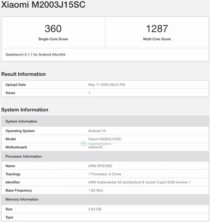 Redmi 10X(型号为Xiaomi M2003J15SC)单核得分360,多核得分1287,运行基于Android 10的操作系统,搭载八核联发科MT6769Z处理器(MTK G85),配备6GB RAM。
