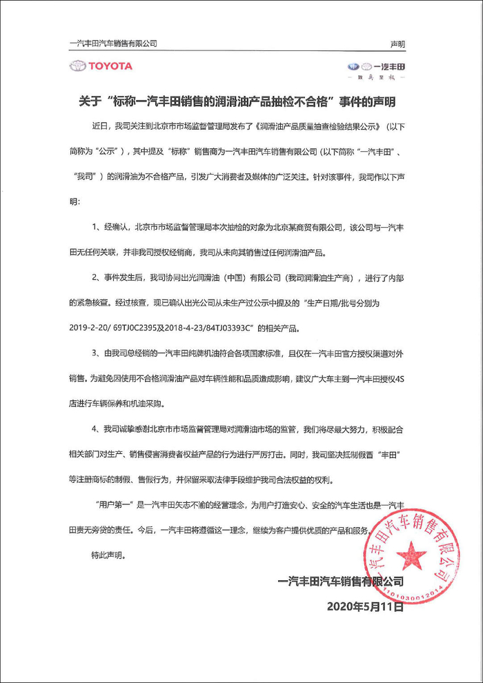 一汽丰田则在《声明》中强调,事件发生后,一汽丰田协同润滑油生产商出光公司进行了内部的紧急核查,确认出光公司从未生产过公示中提及的的相关产品。