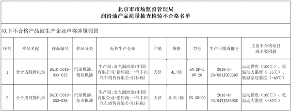 北京市市场监督管理局抽检发现,一汽丰田销售的出光润滑油两款产品不合格