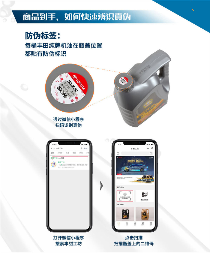 所谓纯牌机油,多数并非是由车企自行生产,而是由生产商代工、经过汽车品牌认证的机油。而一汽丰田也还在官方微博上发布了识别丰田“纯牌”机油的方式:每桶纯牌机油在瓶盖位置都贴有防伪标识。