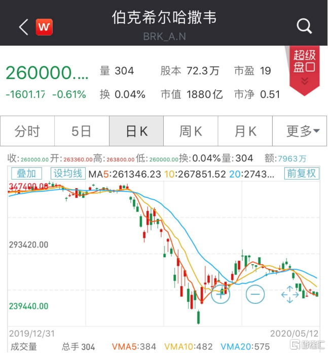 值得注意的是,2019年5月份的股东大会之后,伯克希尔A类股的估值为32万美元,比当前水平高出21%,但账面价值为22.5万美元,低于2020年3 月31日的水平。当时伯克希尔的市净率为1.4倍。