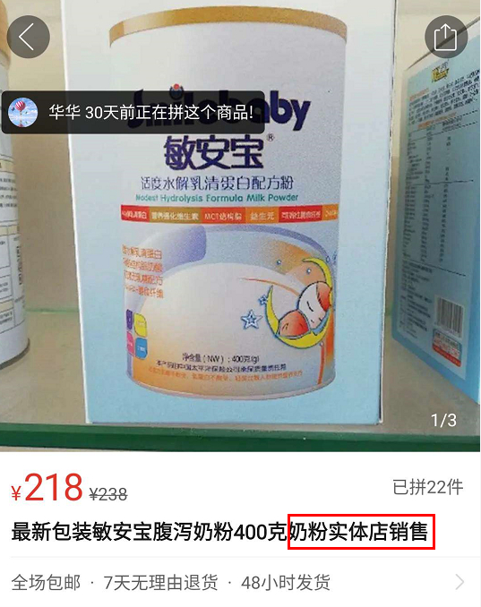 近期,“大头娃娃”事件引起广泛关注。2020年5月14日,被召回的“敏安宝”仍在拼多多销售,商家以“奶粉”的名义违规销售。拼多多弹窗显示,一位名为华华的顾客在30天前拼购这一产品。
