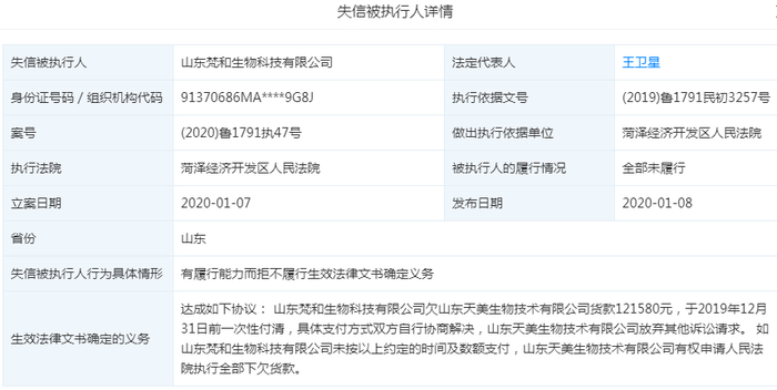 因拖欠货款12余万元,梵和生物被最高人民法院所公示为失信公司,法定代表人王卫星被限制高消费。