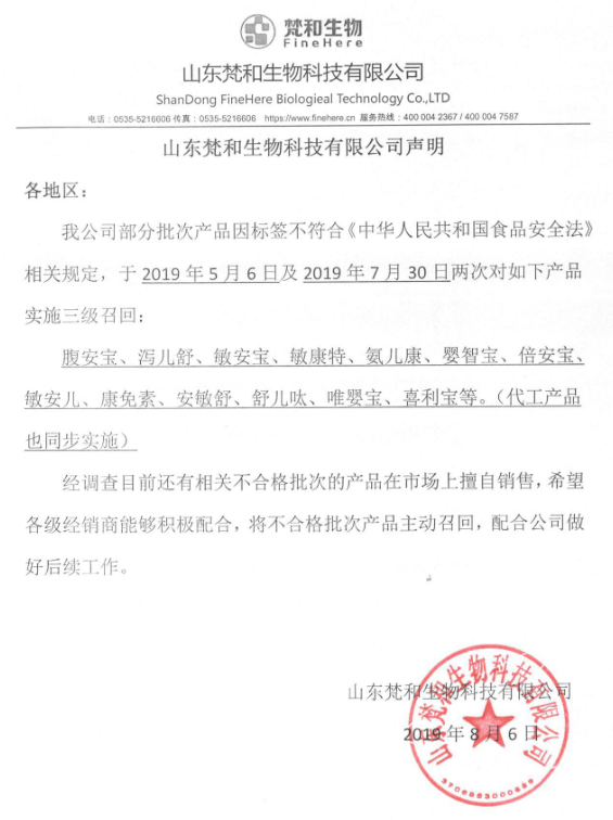 2019年5月6日、6月20日、7月30日、8月6日,梵和生物发布4篇声明,召回违规产品。召回产品包括:腹安宝、泻儿舒、敏安宝、敏康特、氨儿康、婴智宝、倍安宝、敏安儿、康免素、安敏舒、舒儿呔、唯婴宝、喜利宝等。