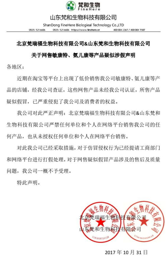 2017年,梵和生物发布的声明称,公司严禁任何单位和个人在网络平台销售我公司的任何产品,也从未授权任何单位和个人在网络平台销售。