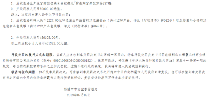 栖霞市市场监督管理局没收其12种违法生产食品、标签不合格的包装罐,并处以45.6万元的罚款。