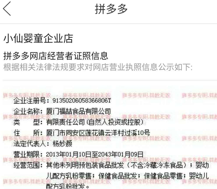 拼多多网店经营者证照信息显示,“小仙婴童”店铺的企业名称为厦门福喆食品有限公司。