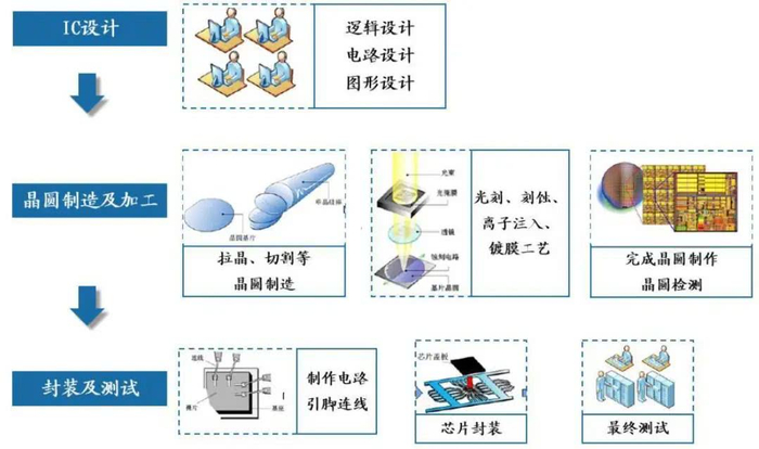 芯片制造分为三个步骤,分别是 IC 设计、晶圆制造及加工、封装及测试这三个步骤。