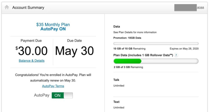 而我正在使用的美国手机套餐是AT&T最基础的预付费套餐,每月35美元(合249人民币),套餐包含每月1GB的4G流量(用完后还有2GB的2G/3G流量) + 无限通话 + 无限短信。由于我设置了自动扣费,所以AT&T每月给了我5美元折扣,实际开支是30美元/月。