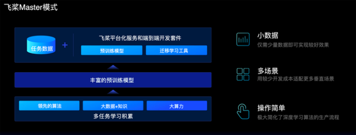 在预训练模型方面,重点聚焦视觉预训练模型和NLP语义理解模型ERNIE;在迁移学习工具方面,飞桨新增了多个前沿的迁移学习算法,提升应用效果。开发者可以使用飞桨开源的PaddleHub,或者EasyDL平台来体验Master模式的优势效果。