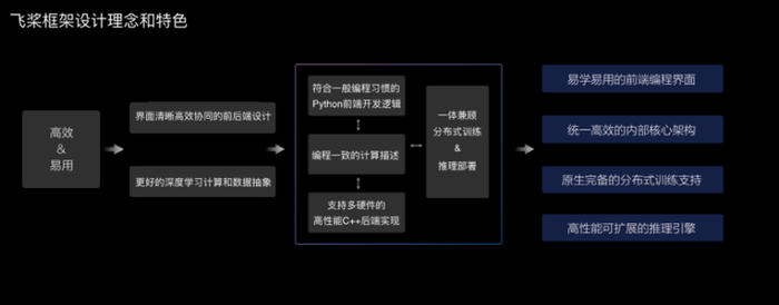 会上,百度飞桨总架构师于佃海于佃海说,飞桨核心框架具备四大特色,包括:易学易用的前端编程界面、统一高效的内部核心架构、原生完备的分布式训练支持、高性能可拓展的推理引擎。