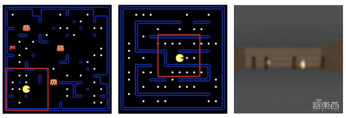▲该研究的数据集样本,训练数据由如红色方框所示的部分状态组成(左:吃豆人,中:吃豆人迷宫,右:VizDoom)
