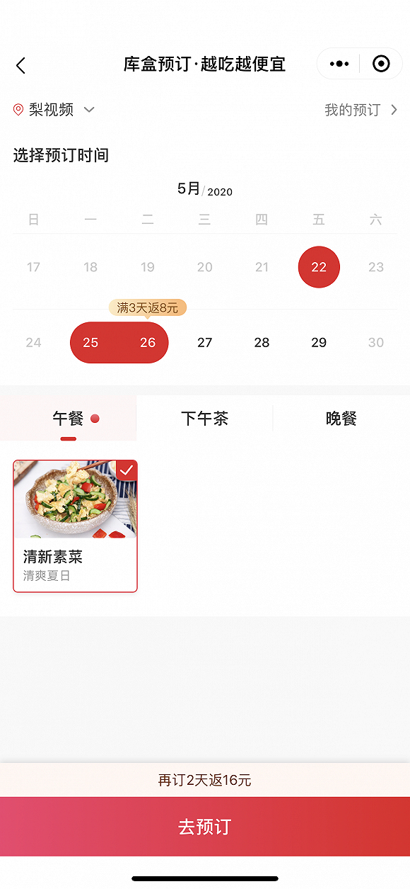 目前库盒主要依托微信小程序运营,其配送范围限定在一些合作的企业园区和相应的企业楼层,餐饮服务范围包括午餐、下午茶和晚餐,订餐时间局限在工作日期间。