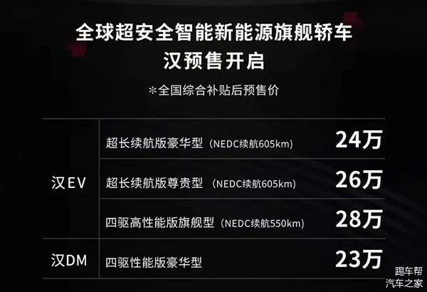 5月19日,预热许久,搭载比亚迪全新磷酸铁锂刀片电池的比亚迪汉开启预售,补贴后DM版预售价格23万元。