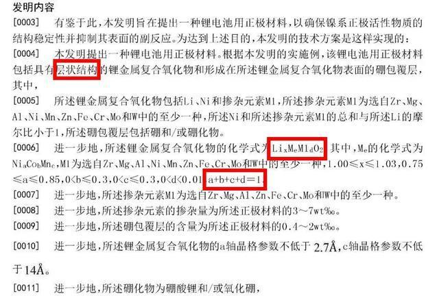 三、蜂巢申请的专利“锂电池用正极材料极其制备方法和应用“中提到了锂金属复合氧化物的化学式如红框所示,且总量为1,这一特征符合层状镍锰酸锂(LiNi0.5Mn0.5O2)而非尖晶石镍锰酸锂(LiMn2O4)。