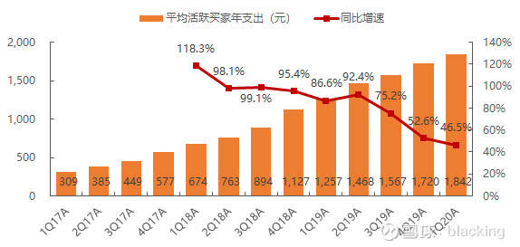 从活跃买家平均年度支出来看,一季度达到1842元,同比增长46.5%,也就是说客单价提供了一半,另外一半贡献来自于用户数。