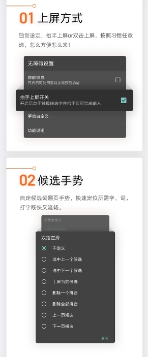 此外,针对用户对于无障碍键盘的不同使用习惯,搜狗输入法还独创了上屏方式和候选手势的自定义功能,视障用户可以根据自己既往的使用习惯和个人偏好,进行自定义设定,不用再费力花时间适应新规则,降低了用户的学习成本,显著提升用户的输入效率。