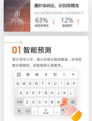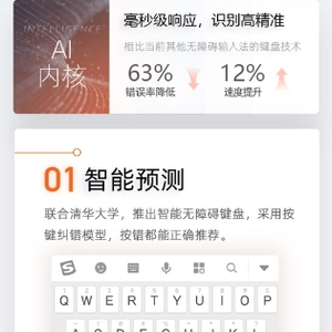而搜狗输入法此次更新的无障碍模式最大亮点就是上线智能按键预测功能。通过与清华大学人机交互实验室合作,搜狗输入法实现了字符级纠错,基于模型反复测试,有效解决了视障用户打字落点不准确的问题,大幅提升了视障群体的输入效率。根据测评数据显示,相比当前其他无障碍输入法的键盘技术,错误率降低了63%,能够精确识别用户输入的按键,使得输入速度提升12%,实现了毫秒级响应。