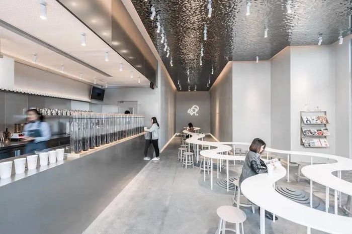 喜茶的 LAB 旗舰店由制冰、甜品、茶极客、插画和周边五个部分组成,茶饮已经不是绝对的主角,营造潮酷的格调,并根据所在城市和场地风格进行调整,比如坐拥海景的深圳 LAB 旗舰店就采用了「沉浸式体验园林」风格。