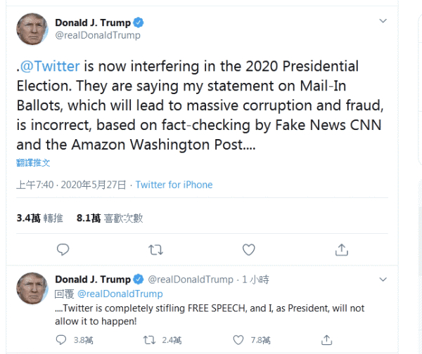 随后,特朗普怒斥推特公司“干预大选、限制言论自由”。特朗普在推特上反击:“推特现在正在干涉2020年总统选举。他们说基于假新闻(媒体)CNN以及亚马逊(控制的)《华盛顿邮报》的事实核查,我有关‘邮寄选票将导致大规模的腐败与欺诈’的推文是不正确的。推特完全扼杀了言论自由,作为总统,我将不会允许这种事情发生!”