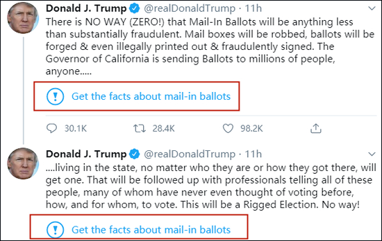 特朗普怒怼推特“干预大选” 只因推文被标“事实错误”......