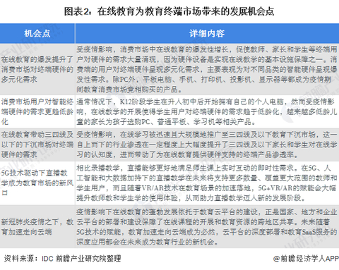 在线教育主要通过直播、录播、音频、微课等不同的教学方式满足不同地区和不同条件下的学生学习需求,通常线上教学过程中教师需要借助硬件设备、云平台、软件和内容以及基础的网络设施等来满足直播和录播等不同教学方式的开展。在线教育在疫情期间被按下的快进键,为教育终端细分市场带来了多个发展机会点。