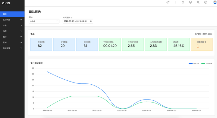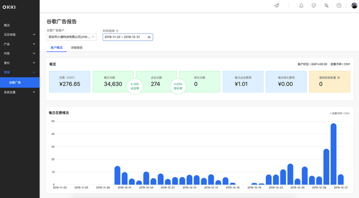 另外,使用新产品后,客户无需借用外网即可在OKKI Marketing中查看谷歌广告报告,获取详尽且最早能支持到前一天的数据。同时,客户可随时查看自己官网的访客访问统计和分布区域数据,还可根据地区分布下载做详细的数据分析。