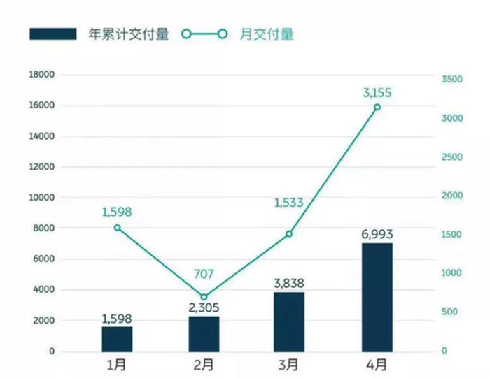 小鹏汽车也是造车新势力的头部力量之一,2019年累计销量达到了16608台。今年4月份,小鹏汽车销量达1233台,环比增长11.3%,同比下滑31.3%,1-4月累计销量达3564台,同比增长27.5%,其中个人用户达87%。随着小鹏P7的交付后,小鹏汽车的销量或将得到进一步增长。但是就其目前表现来看,小鹏汽车要完成年底交付4万台的目标,依然面临较大压力。
