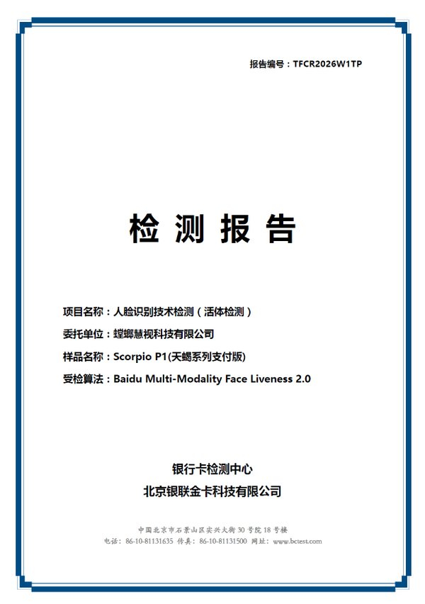 螳螂慧视(Mantis Vision)携天蝎系列3D传感设备深度适配百度大脑人脸识别,正式通过金融行业国家级权威性检测机构 --银行卡检测中心的权威技术检测,获得人脸识别产品类活体检测增强级认证。