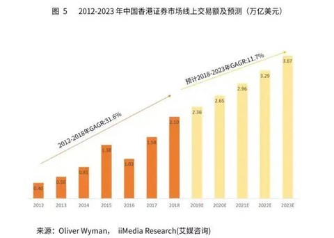 香港在线交易规模2012-2018年年均复合增长率达31.6%,预计未来几年将以11.7%的年均复合增长速度持续增长。