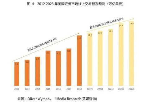 美国证券市场发展较为成熟,以机构投资者为主,预计未来几年线上交易规模将以5.0%的年均复合增长率稳定增长,2023预计接近15万亿美元。