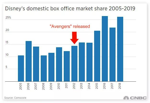 迪士尼今年在美国总票房中占比达到38%,标志着其好莱坞战略达到一个高潮。这个战略已经进行了15年,而最开始时,迪士尼的票房占比大约有10%。