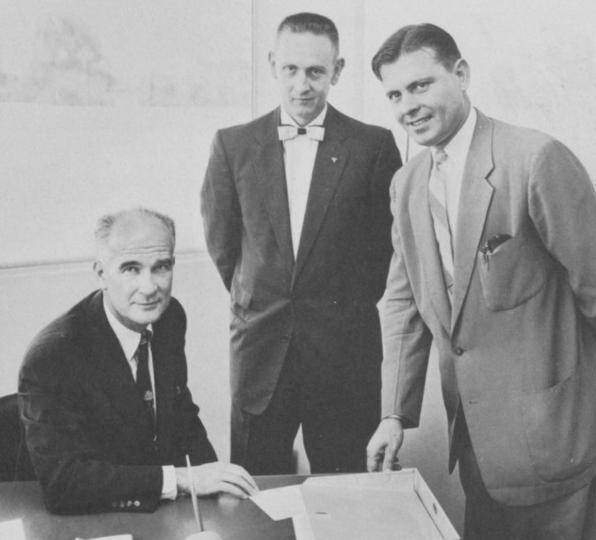 William Shockley,Smoot Horsley 和 Dean Knapic 在 Shockley 半导体实验室工作