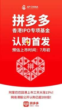 两个小时后,李晓在微信群里看到了另一张销售海报。红色背景下,几行白色字体显得更加扎眼,「拼多多香港IPO专项基金认购首发」,底下的小字甚至还标清了日期,「预计上市时间:7月初」。