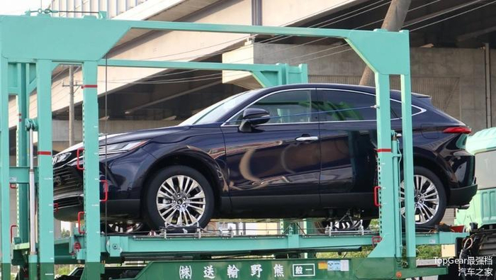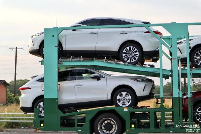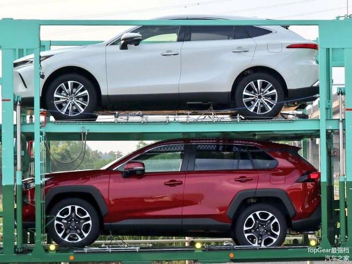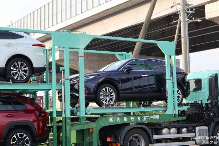 在照片中的这辆运输车上,我们可以看到4辆Harrier和一辆RAV4。货车车尾有两辆白色的Harrier,中间部分在红色RAV4上方还有一辆。通过轮圈的区别能够大致辨别出,最下边的Harrier应该是低配车型,红色RAV4上方是中配车型,货车尾部上方的白色和另外一辆深蓝色(也可能是黑色)Harrier是高配车型。