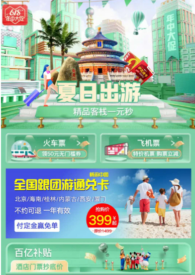 这在拼多多今年的618上得以印证,拼多多今年在618旅游业务上专门在APP显著位置打造出“夏日出游会场”,其中两大主营业务,“火车票”与“机票”都有不同力度促销。