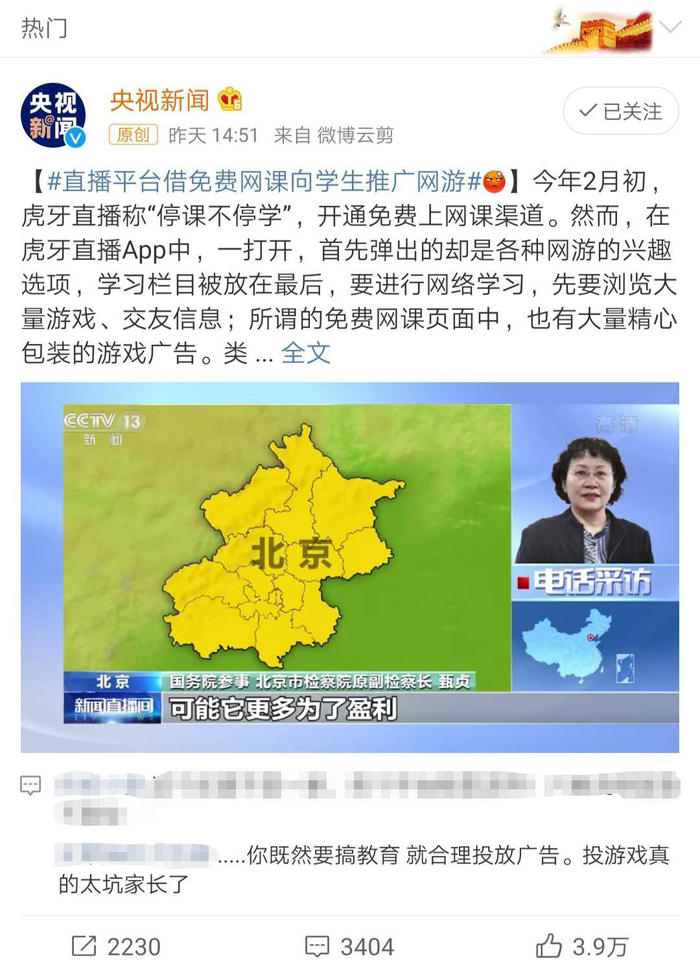 “网课”变“网游”,被央视新闻点名批评,虎牙的商业险棋