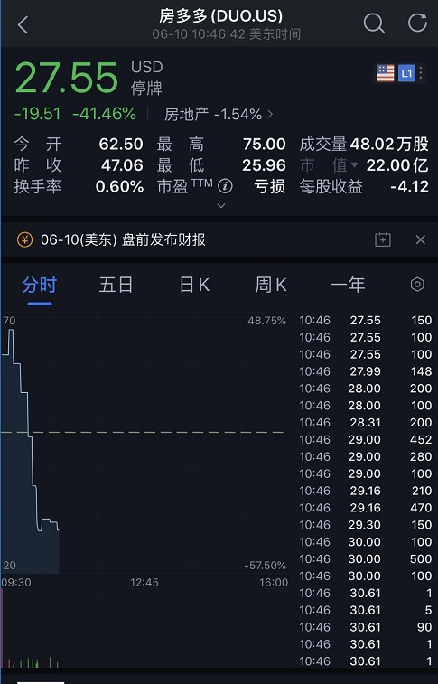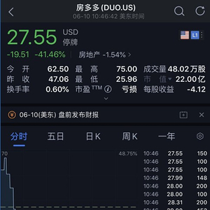 房多多今日盘中第10次触发熔断,股价大跌逾40%。