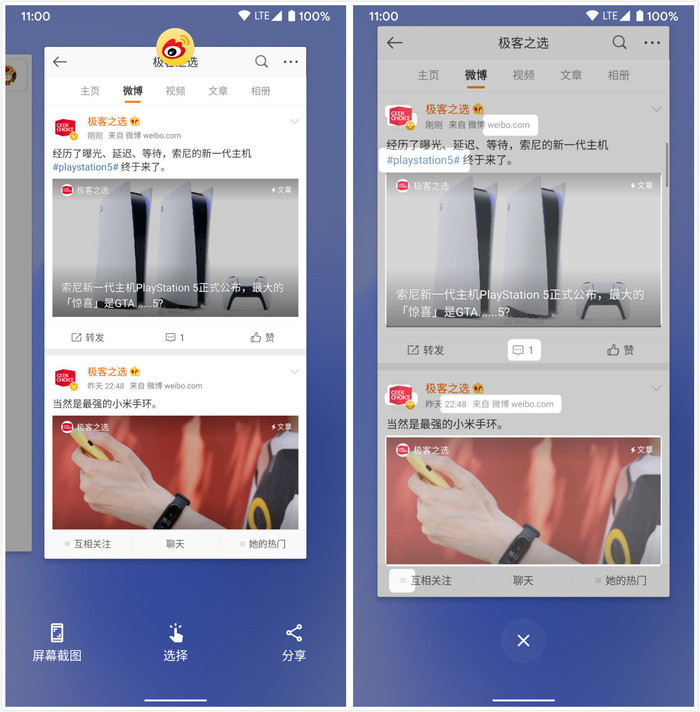 多任务界面下方也是三个按钮,屏幕截图、选择、分享。「选择」这个功能很有意思,可以选择画面上的文字进行复制、搜索,它未来的形态应该是大爆炸,罗老师NB。