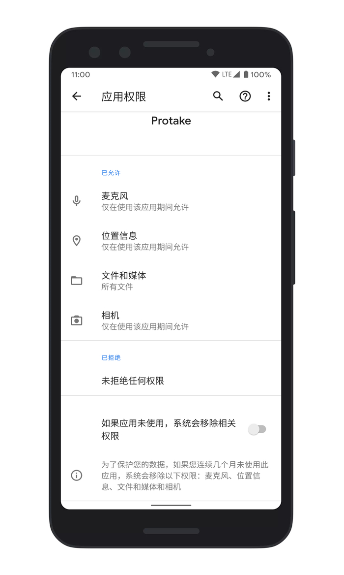 不光是iOS,原生Android这几年也一直将安全隐私作为工作重点。Google再一次向苹果看齐,引入了「仅一次」的权限许可,在此之下是「仅在应用使用期间」和「永久开启」。有一些没那么常用的应用会在获取权限后,长期在后台收集你的数据,你可以用「仅一次」来加以限制。