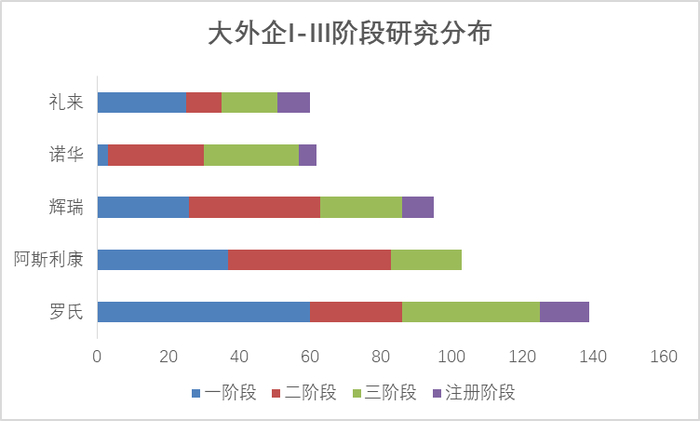 罗氏注册阶段研究14项,数量非常可观,为罗氏加速新品上市打下卓越基础,相信其在未来3-5年会持续高歌猛进。III阶段研究中,罗氏、辉瑞和诺华变现优异,罗氏以39项,拔得头筹。