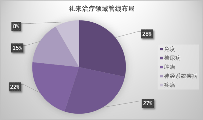 礼来管线主要分布于免疫、糖尿病、肿瘤、神经系统和疼痛领域,礼来是五个大外企唯一没有肿瘤优先的企业,相反其在免疫和糖尿病领域的比重超过肿瘤。而礼来管线也呈现出各治疗领域相对平均的布局,这种战略也帮助礼来低调而稳健前进。