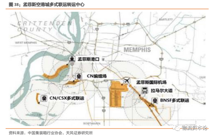 其次,两条州际高速公路交会于此,货运集装箱可以通过卡车在10个小时内抵达美国本土三分之二的地区。第三,孟菲斯铁路交通比较发达,火车站紧邻密西西比河,有利于水陆联运节省成本。