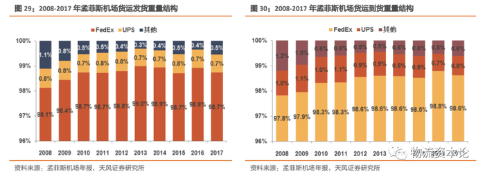 考虑货源,孟菲斯机场的货运主要来源于FedEx。2008-2017 年间,FedEx 占据孟菲斯机场装载重量和卸货重量的98%以上,UPS仅占0.7%-0.9%。