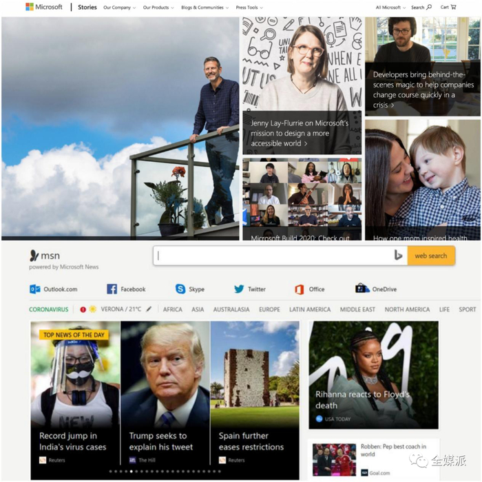自1995年创建门户网站MSN以来,微软涉足新闻媒体行业已有25年之久。MSN.com和微软新闻(Microsoft News)一直为读者提供原创文章及其它聚合型的信息服务,例如天气预报、邮件查询等。