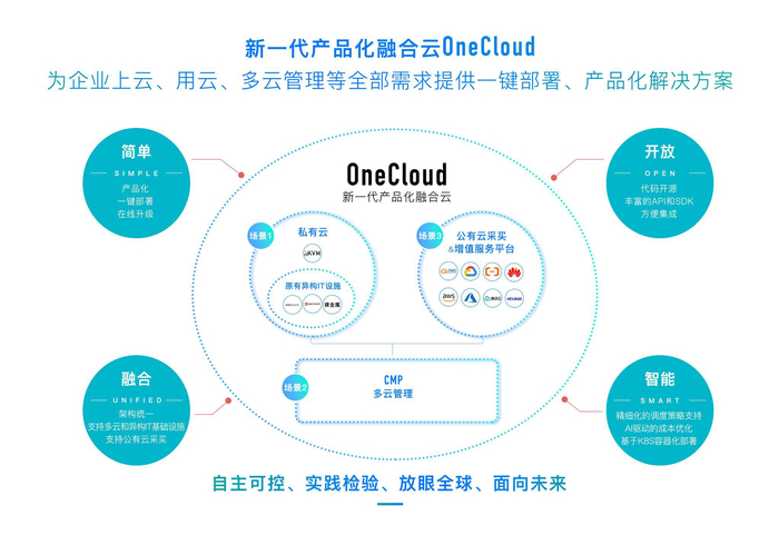OneCloud有三大应用场景:私有云、CMP(多云管理平台)以及公有云采买&增值服务平台。OneCloud从架构设计和用户体验上,更强调统一融合,希望给到客户只用“一朵云”的服务体验,而不是只提供多个云的管理工具。