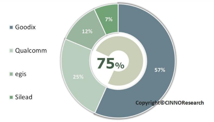 ▲2019年全球屏下指纹芯片市场出货占比(内圈为光学屏下指纹芯片出货占比),数据来源:CINNOR Research