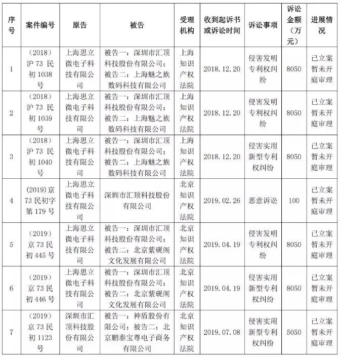 激烈的竞争也免不了摩擦,思立微、汇顶、神盾在专利权上就没少上法院。仅从2018年12月到2019年7月,涉及其三家的专利侵权案件就达7件,诉讼金额已经达到4.54亿元。有意思的是,这些案件虽已立案,但并未开庭审理。