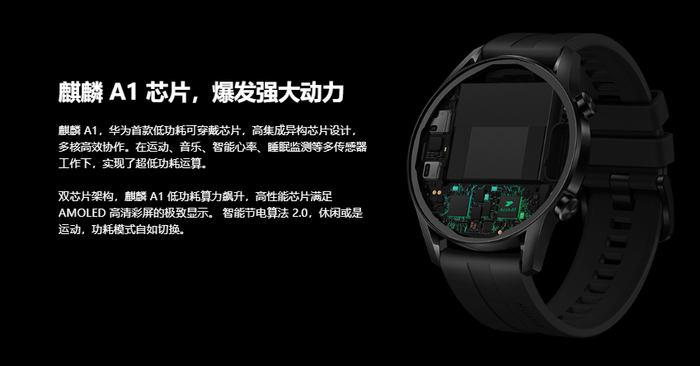 华为 Watch GT2 内置的是华为自研的低功耗可穿戴芯片麒麟 A1,配合智能节电算法 2.0,让华为 Watch GT2 的续航能够达到 14 天的时间,连续 GPS 定位 30 小时,足以满足用户使用需求。