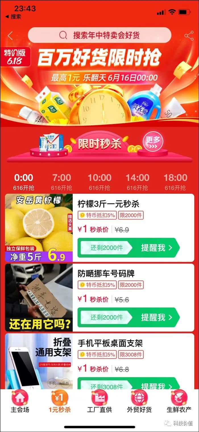 据知名电商媒体人吴蚊米爆料,从6月16日0点开始,淘宝特价版已经开放1元专区,包括服装、食品、家具用品等在内的100万件商品全场1元包邮,并分为0点、7点、10点等五个批次限时秒杀。而在前一日的下午4点,淘宝特价版App在各大应用市场下载量已超过京东、拼多多,登顶AppStore购物应用榜。据了解,截至6月1日,淘宝特价版已吸引超120万产业带商家入驻,成为外贸工厂最大内销平台。